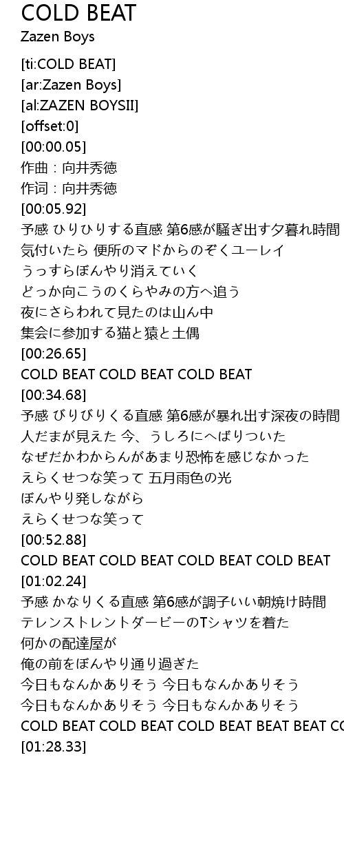 | [00:53.65] | COLD BEAT COLD BEAT COLD BEAT COLD BEAT |