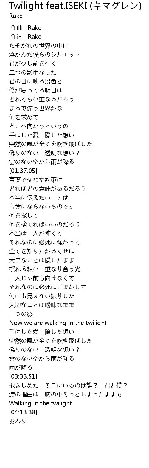 | [03:38.76] | 抱きしめた そこにいるのは誰? 君と僕? |