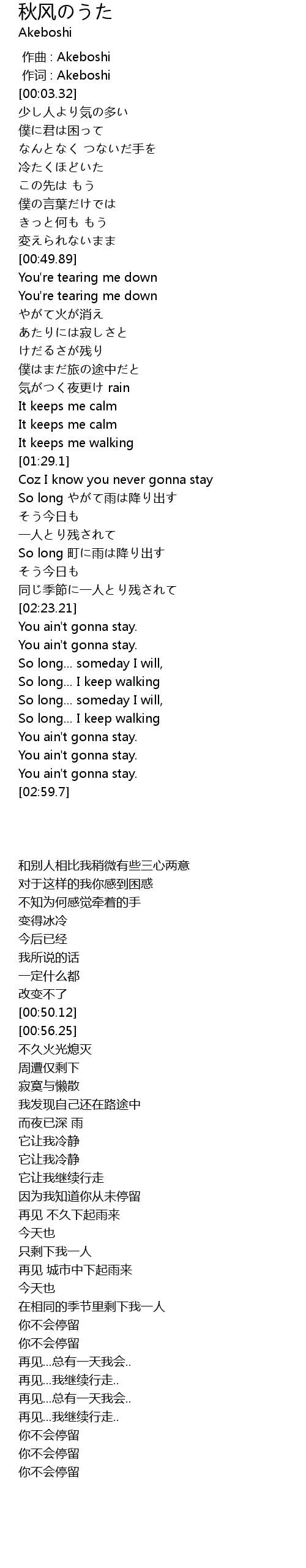 | [00:01.00] | 作词 : Akeboshi |
