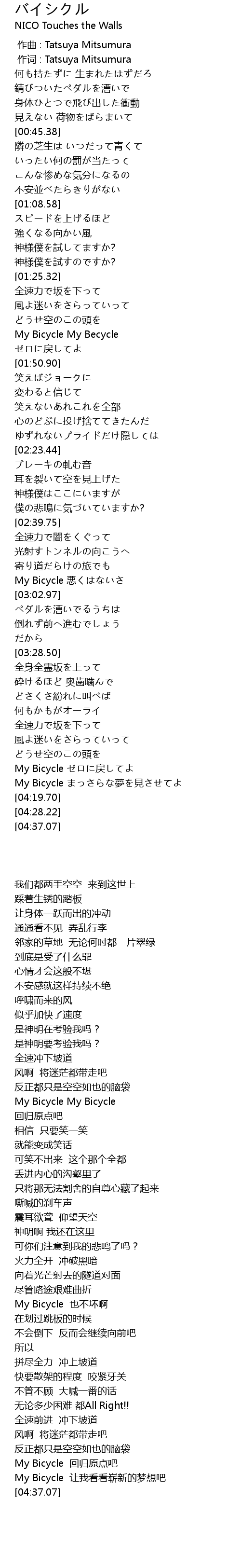 | [04:06.90] | My Bicycle ゼロに戻してよ |