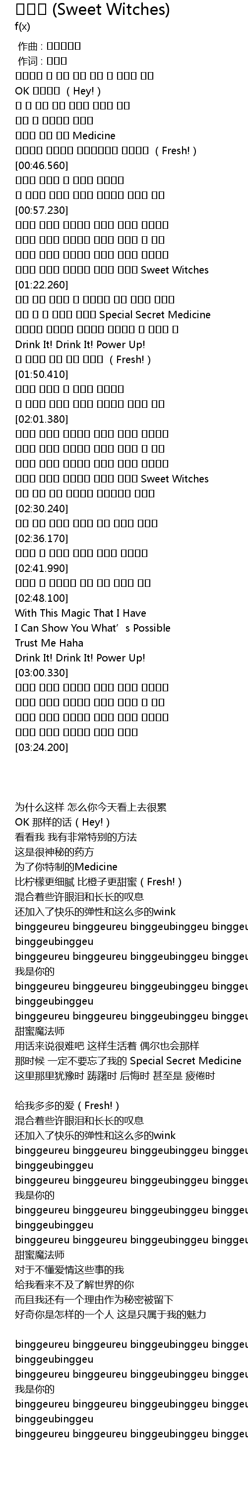 | [02:19.740] | 빙그르 빙그르 빙글빙글 빙그르 빙그르 Sweet Witches |