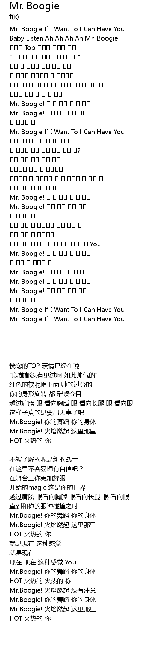 | [01:36.520] | Mr. Boogie! 불을 켰지 여기 저기 |