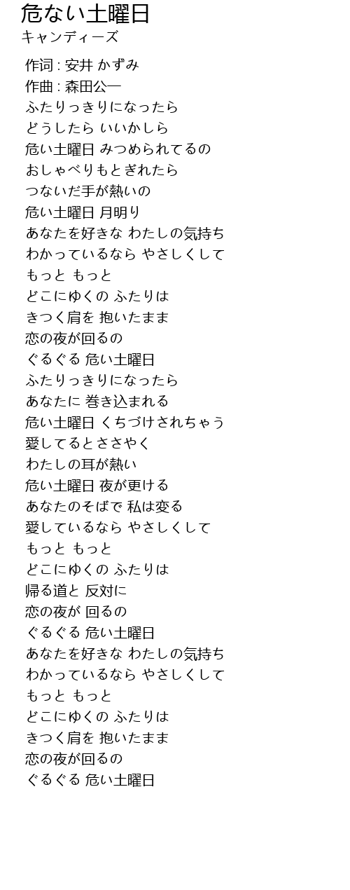 | [00:19.525] | 危い土曜日 みつめられてるの |