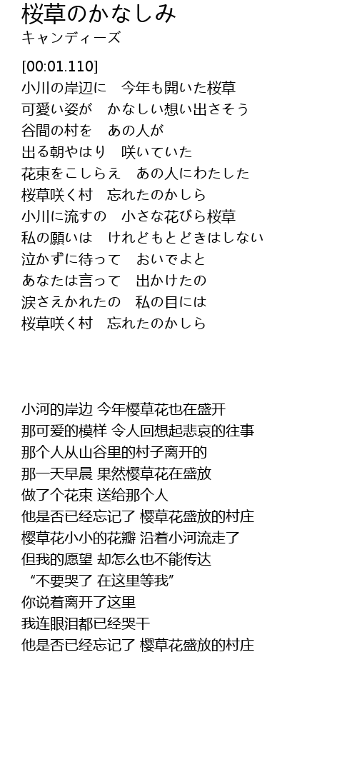 | [01:25.642] | 小川に流すの 小さな花びら桜草 |