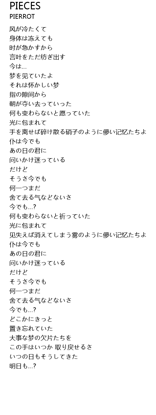 | [01:15.46] | 手を离せば碎け散る硝子のように儚い记忆たちよ |