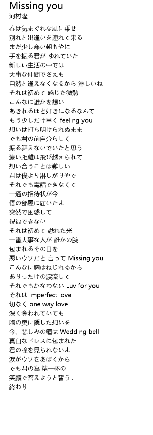 | [03:21.20] | 悪いウソだと 言って Missing you |