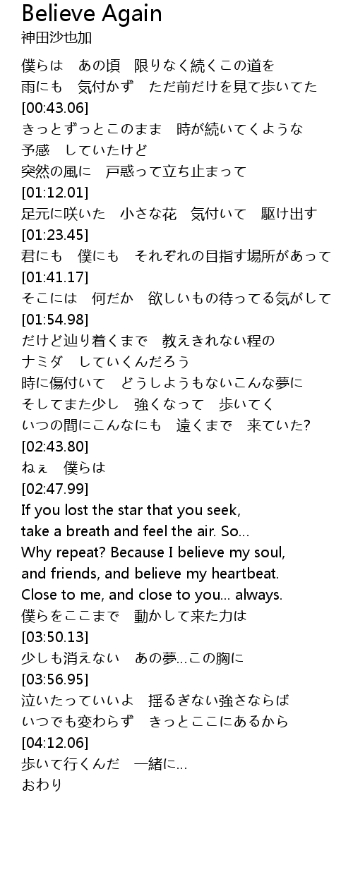 | [03:31.12] | and friends, and believe my heartbeat. |