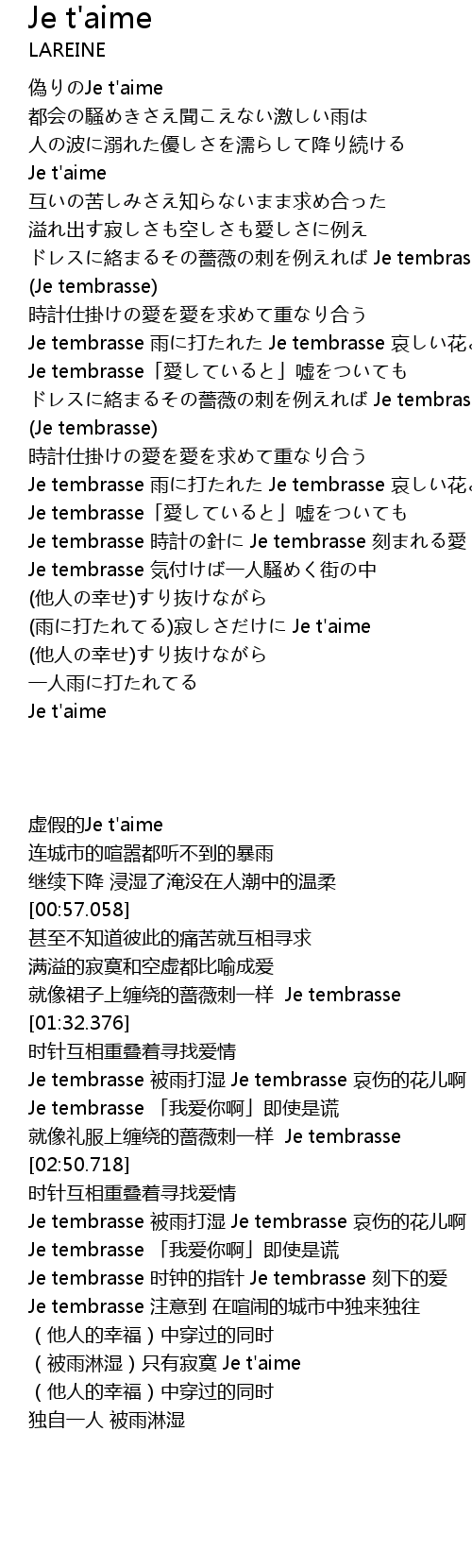 | [01:44.410] | Je tembrasse 雨に打たれた Je tembrasse 哀しい花よ |