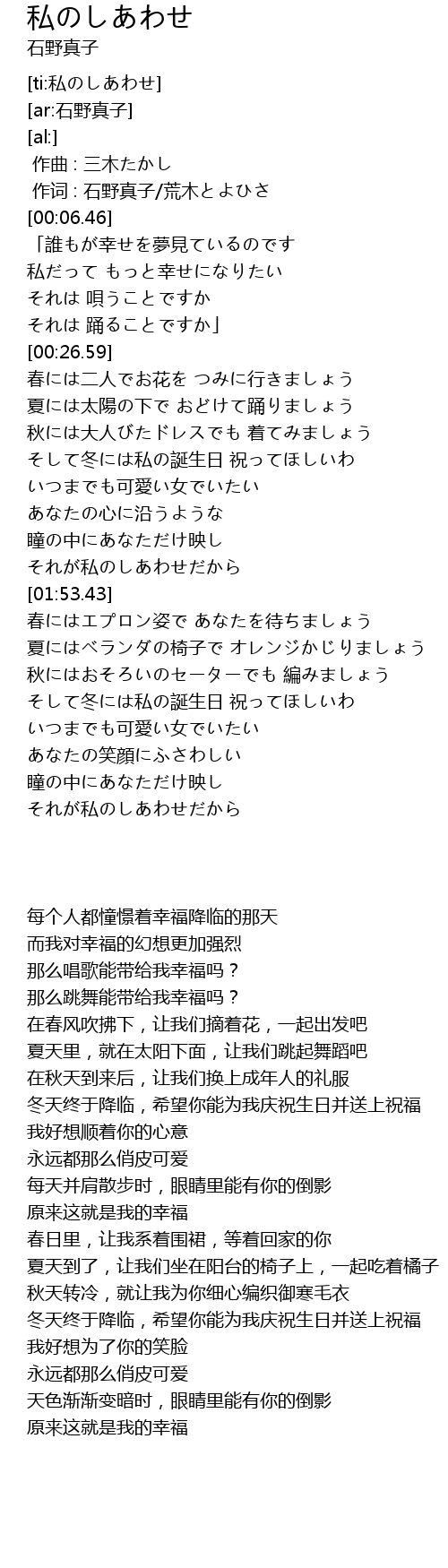| [00:01.00] | 作词 : 石野真子/荒木とよひさ |