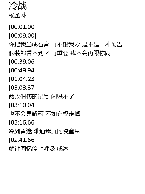 | [03:50.95][02:41.66][01:31.93] | 冷战到何时能平息 放我离去 |