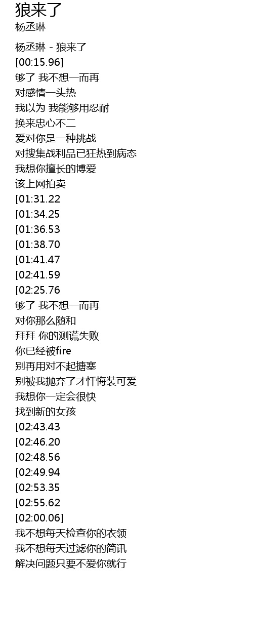 | [00:01.20] | 杨丞琳 - 狼来了 |
