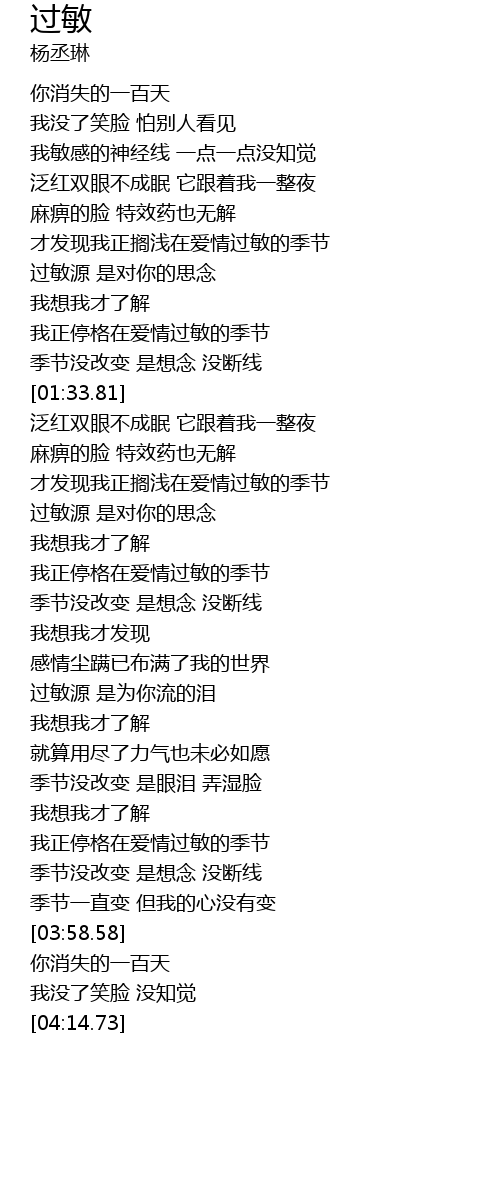 | [03:34.88] | 我正停格在爱情过敏的季节 |