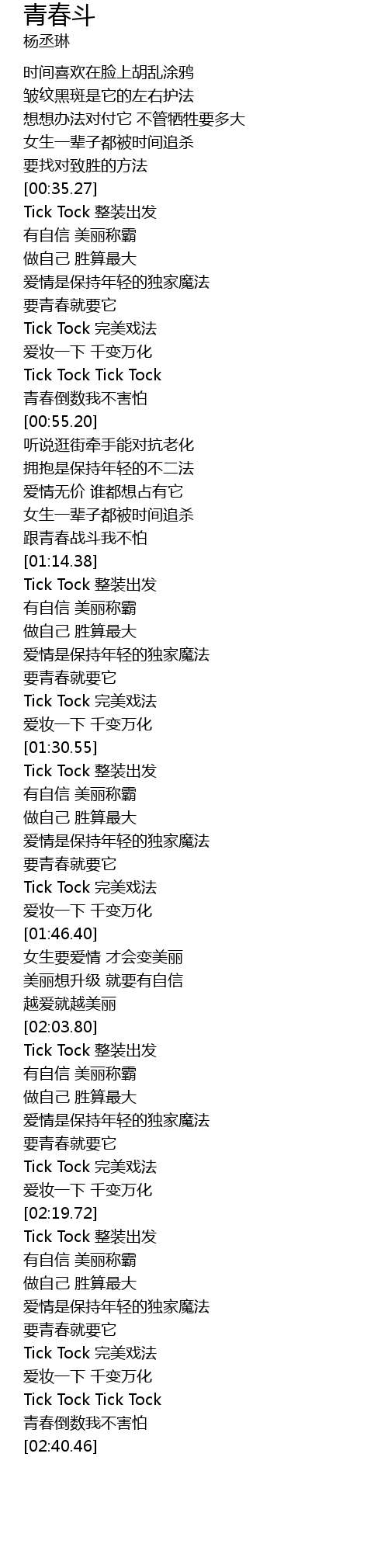 | [00:35.85] | Tick Tock zhěng zhuāng chū fā |