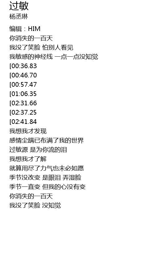 | [02:23.58][01:06.35] | 过敏源 是对你的思念 |