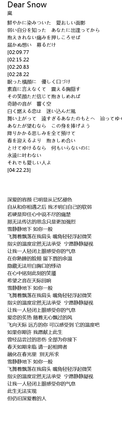 | [03:23.62][02:09.77][00:54.49] | 雪はただ静かに まるであなたのように |