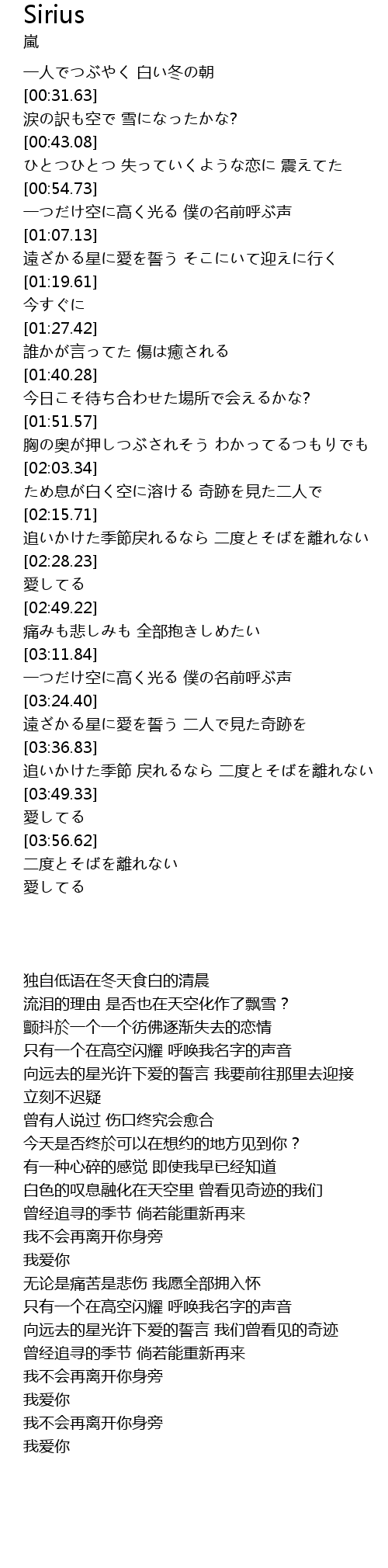 | [02:03.59] | ため息が白く空に溶ける 奇跡を見た二人で |