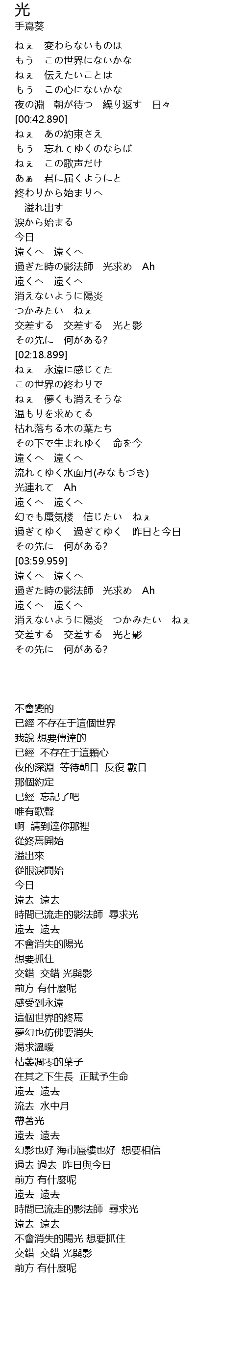 | [01:38.300] | 過ぎた時の影法師 光求め Ah |
