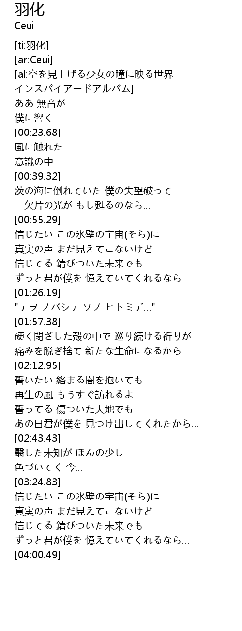 | [00:55.69] | 信じたい この氷壁の宇宙(そら)に |