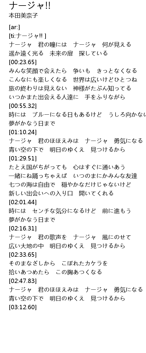 | [01:10.54] | ナージャ 君のほほえみは ナージャ 勇気になる |