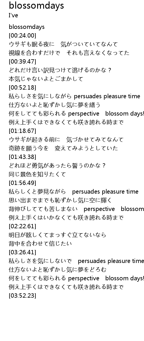| [02:09.46] | 背伸びしてても苦しまない perspective blossom days!! |