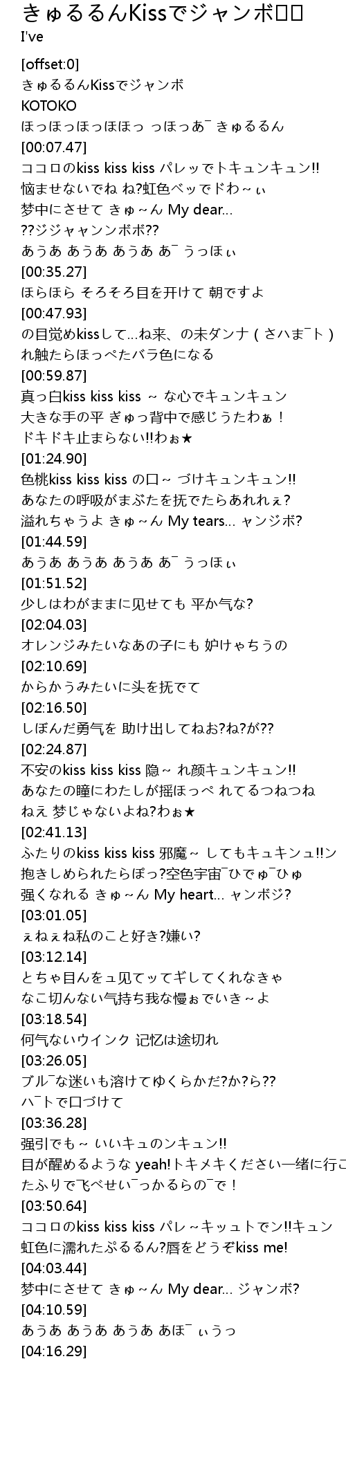 | [03:54.15] | ココロのkiss kiss kiss パレ~キッュトでン!!キュン |