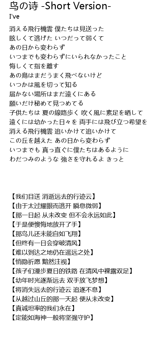 | [00:15.03] | 消える飛行機雲 僕たちは見送った |