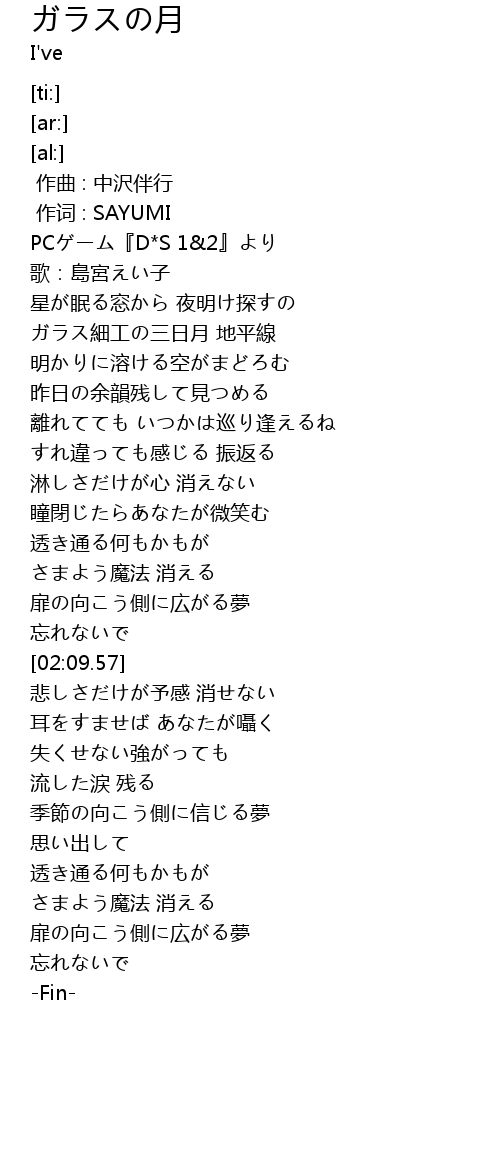 | [00:35.95] | ガラス細工の三日月 地平線 |
