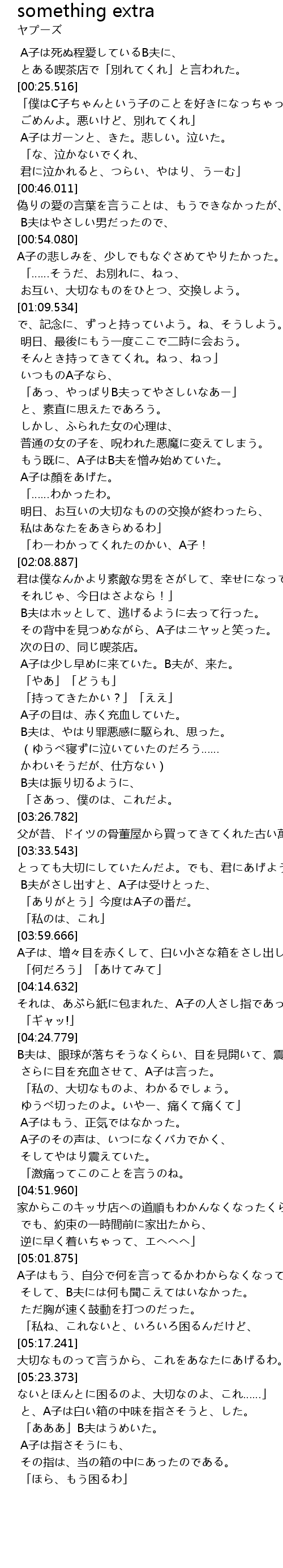 | [04:14.632] | それは、あぶら紙に包まれた、A子の人さし指であった。 |