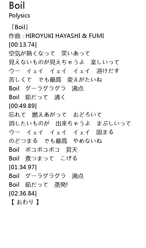 | [00:39.64] | Boil グーラグラグラ 沸点 |