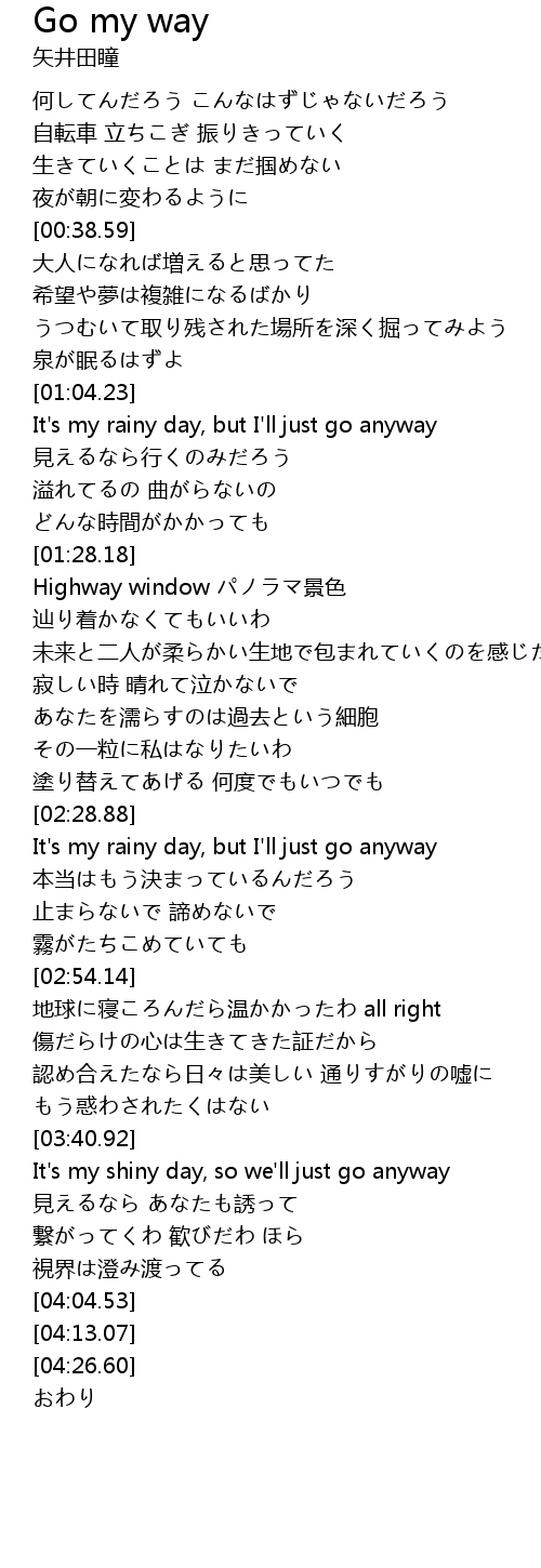 | [03:41.69] | It' s my shiny day, so we' ll just go anyway |