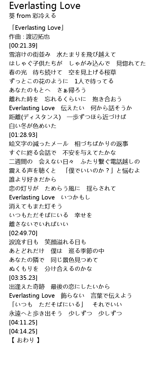 | [03:45.39] | Everlasting Love 飾らない 言葉で伝えよう |