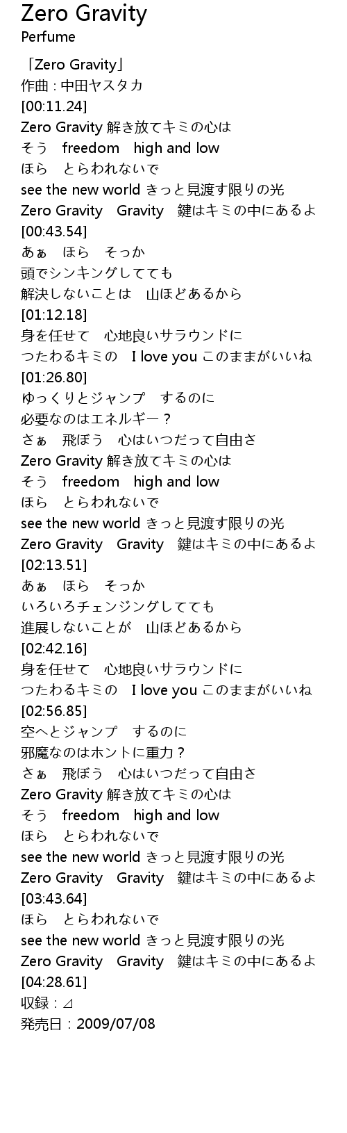 | [00:13.24] | Zero Gravity 解き放てキミの心は |