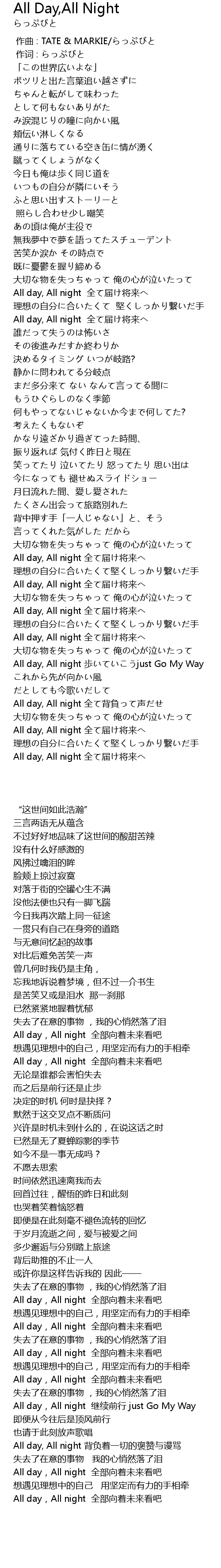 | [03:39.98] | All day, All night 全て背負って声だせ |