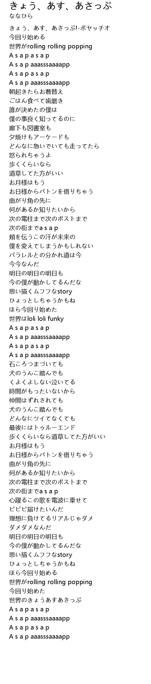 | [00:00.432] | きょう、あす、あさっぷ!-ポヤッチオ |