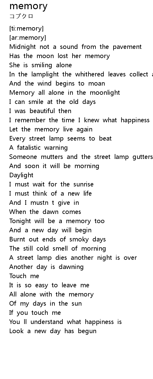 | [00:20.88] | In the lamplight the whithered leaves collect at my feet |
