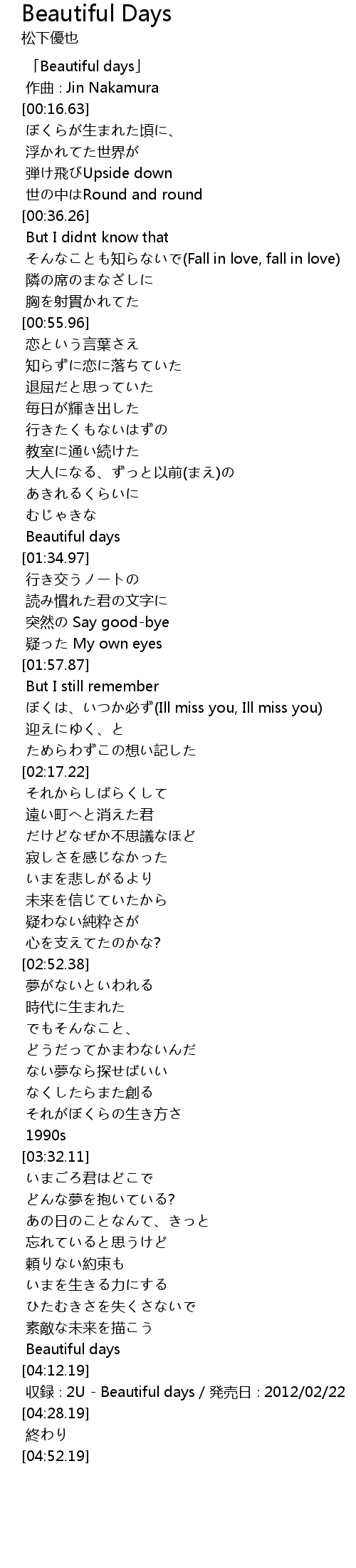 | [04:20.19] | shōu lù 2U Beautiful days fā mài rì 2012 02 22 |