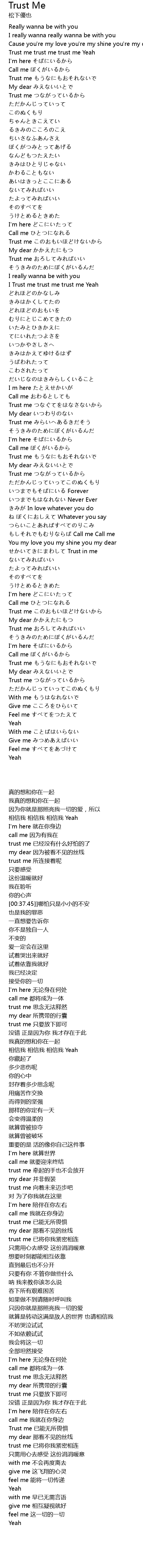 | [00:15.68] | Trust me もうなにもおそれないで |
