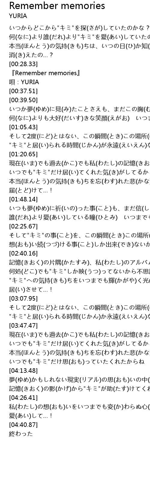 | [02:42.56] | 記憶(きおく)の片隅(かたすみ)、私(わたし)のアルバムの中(なか)は |