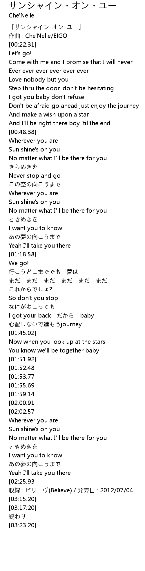 | [03:10.20] | 収録∶ビリーヴ(Believe)/発売日∶2012/07/04 |