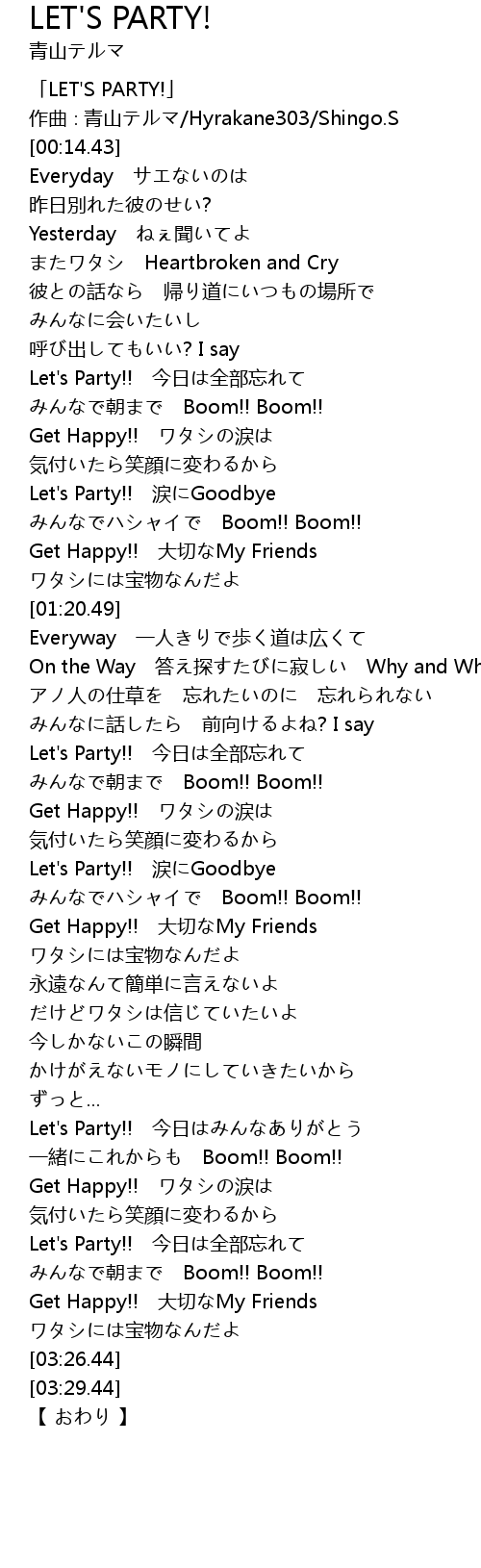 | [03:10.23] | Let's Party!! 今日は全部忘れて |