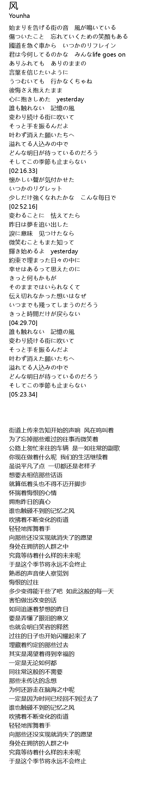 | [00:51.92] | 君は今何してるのかな みんなlife goes on |