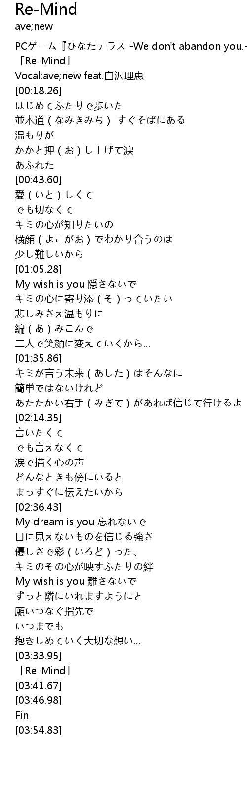 | [00:02.74] | PCゲーム『ひなたテラス -We don't abandon you.-』EDテーマ |