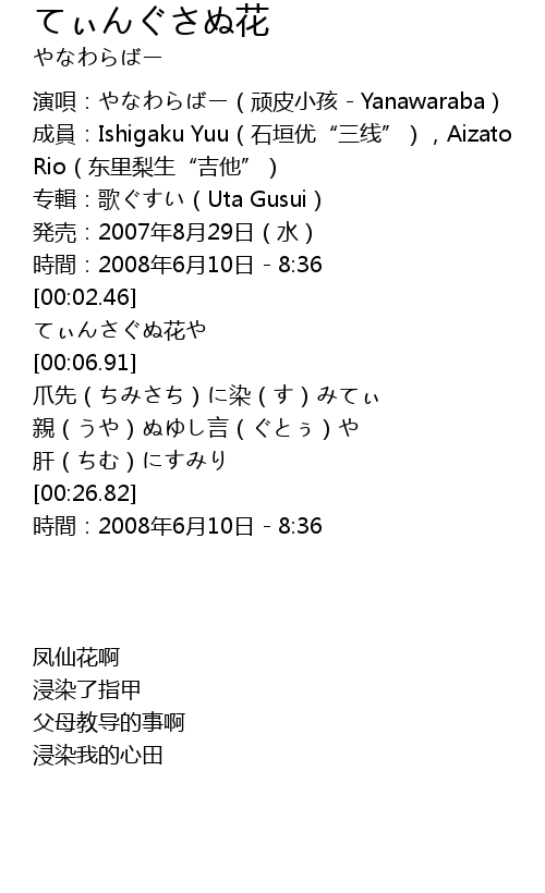| [00:01.04] | 演唄:やなわらばー(顽皮小孩 - Yanawaraba) |
