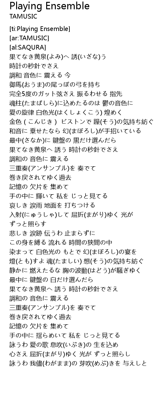 | [03:33.85] | 三重奏(アンサンブル)を 奏でて 巻き戻されてゆく過去 |
