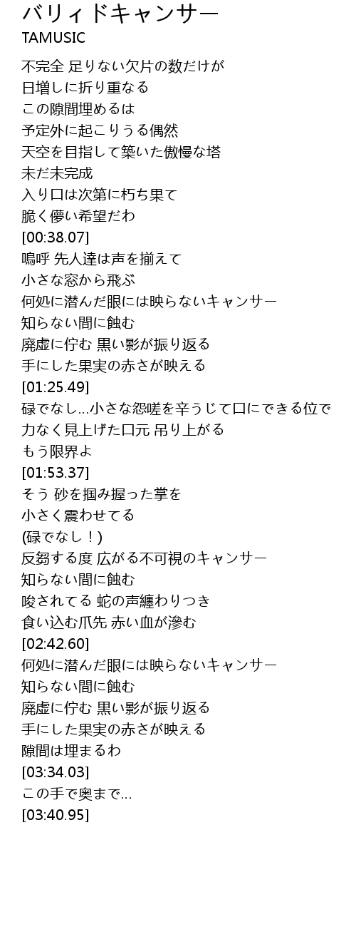 | [00:58.05] | 何処に潜んだ眼には映らないキャンサー |