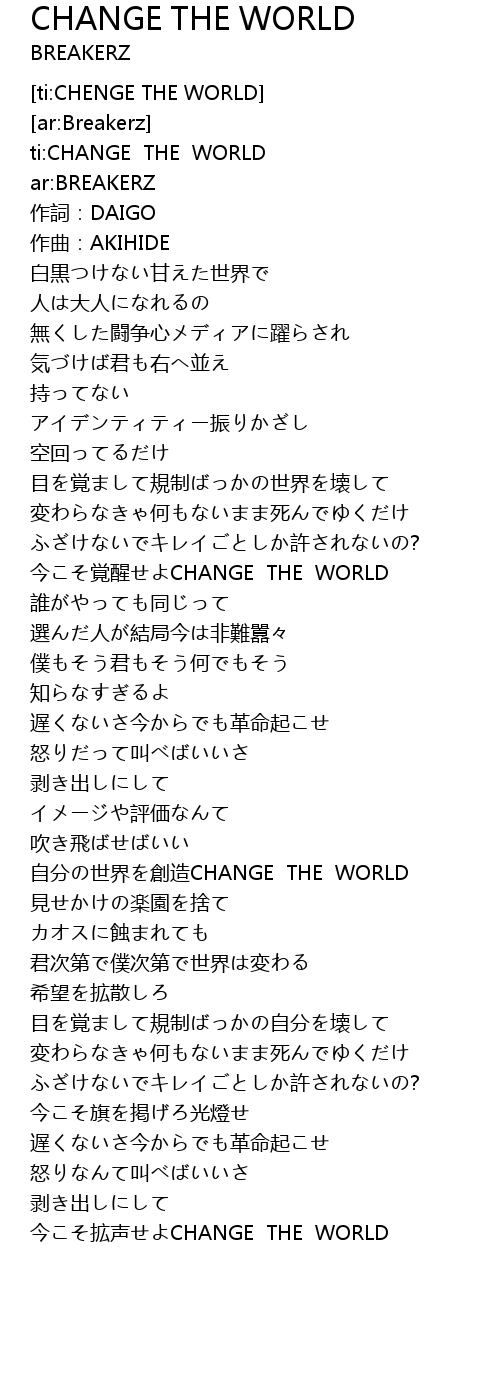 | [00:01.940] | ti: CHANGE THE WORLD |