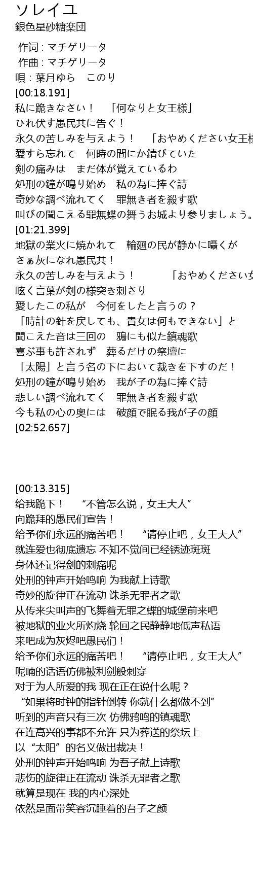 | [02:31.320] | 処刑の鐘が鳴り始め 我が子の為に捧ぐ詩 |