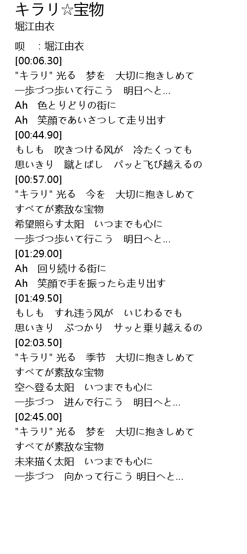 | [02:54.00] | "キラリ" 光る 梦を 大切に抱きしめて |