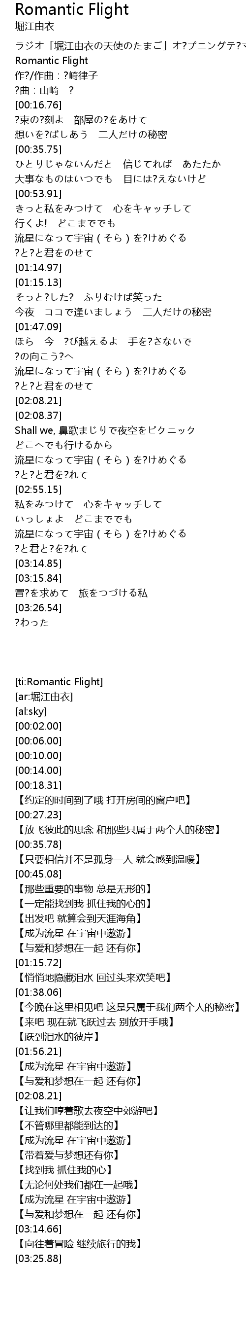 | [00:01.49] | ラジオ「堀江由衣の天使のたまご」オ?プニングテ?マ |