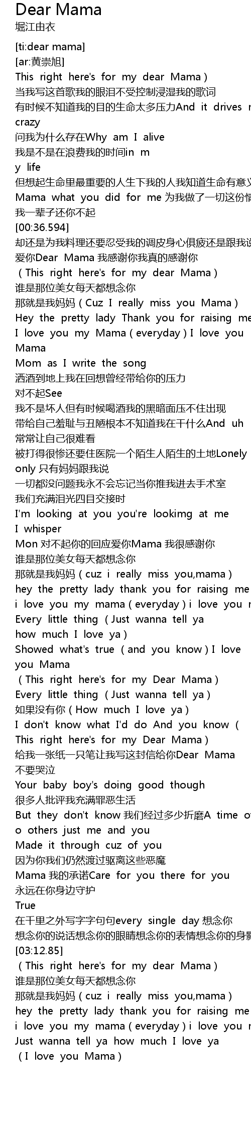 | [00:47.591] | ài nǐ Dear Mama wǒ gǎn xiè nǐ wǒ zhēn de gǎn xiè nǐ |